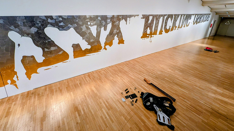 Élodie Lesourdは、メタルはメタルでも、音楽のメタルを題材にした作品が目立つ。壁にアルミテープと金箔で描かれた作品「OFO」は、” Ozzy Fucking Osbourne”に捧げたもの。床には、破壊されたエレキ・ギター。