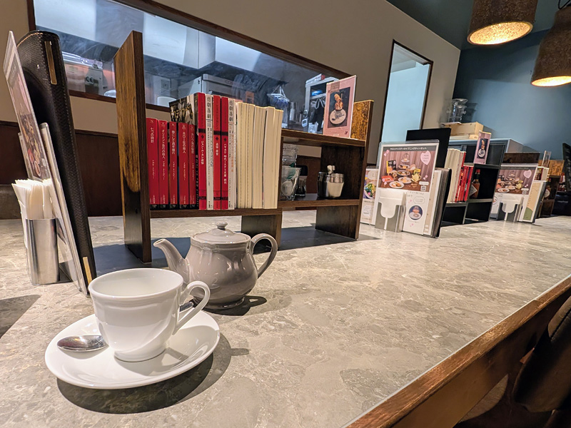 とてもセンスの良い店内だ。大テーブルと、オリエント急行の客室のような半個室のテーブル席。大テーブルには、ミステリ・マガジンやSFマガジン、そして、お馴染みの赤い背表紙の文庫本などが並ぶ仕切りがあって、カウンターのようになっている。