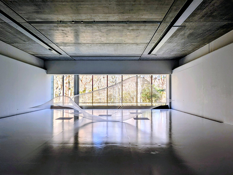 お目当ての展覧会。会場に入って最初の展示は、大巻伸嗣のインスタレーション「Liminal Air Space-Time」。大きな窓を背景に、薄い布がファンによってフワフワとたなびく。確かに、春らしい躍動感に溢れていて、気分が上がる。