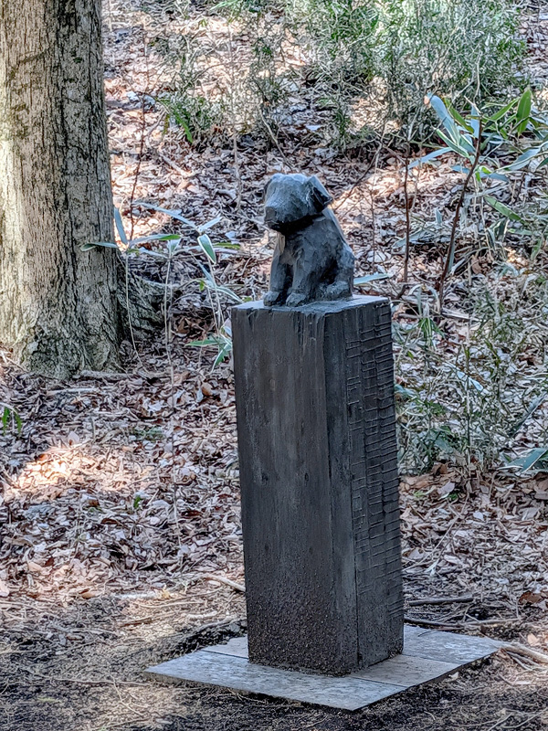美術館の入り口で出迎えてくれた「雪の子」の作者、板東優の彫刻も、森の中に点在していた。雨雪の天気を避けて、晴天の日に訪れて大正解だ。