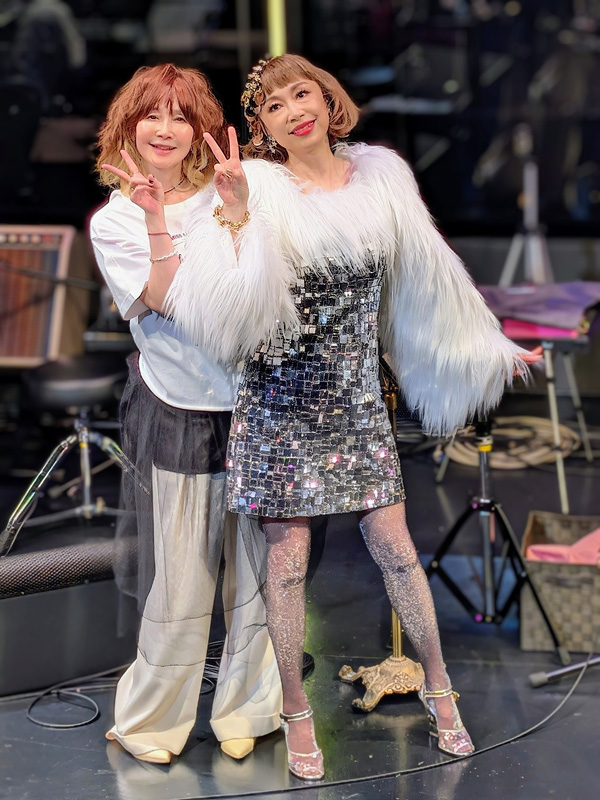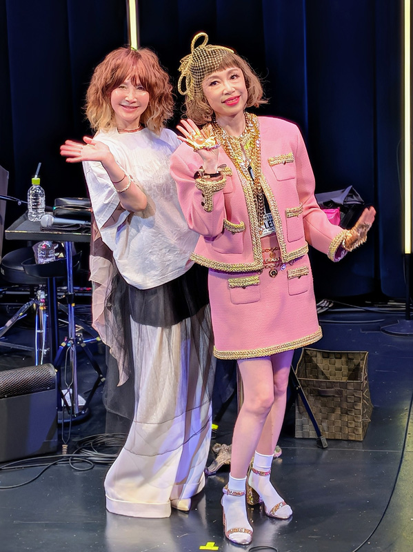 1980年代、野宮真貴のポータブル・ロックと、YOUのFAIRCHILDで対バンしたこともあるという2人だが、ずっと現役ミュージシャンの野宮真貴に対し、ステージで歌うのは30年ぶりというYOU。まずは、2人のヴォーカル & 曲間の小芝居付きの「不景気」。