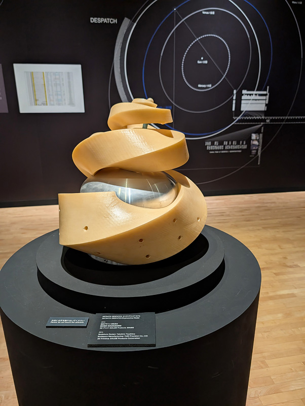 写真は、深宇宙彫刻「ARTSAT2 DESPATCH」の実物大模型。3Dプリンターで製作した機体をJAXA H-ⅡAロケットで地球脱出軌道へと投入。深宇宙からの電波を世界中のアマチュア無線家の協力で受信するというプロジェクト。2014年12月3日に打ち上げられ、12月14日には、470万Kmというアマチュア無線最遠の通信記録を達成したという。今でも、この機体が宇宙空間を旅しているというのは、確かに実感できるロマンだ。