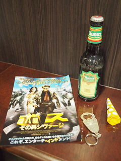 まずは、映画館ロビーで、カレー(南インド料理ポンディシェリ特製『ボス』サンバル)を受け取る。本格南インドの味。そして、ビールはRajniのためならと、無償提供されたウッドペッカー & ハンタービールの二種。ビールと一緒に、栓抜き、チラシ、そしてクラッカーが配られる。カレーは一人一杯だけだが、ビールは、空き瓶と引き替えに、何本でもお代わりOK。