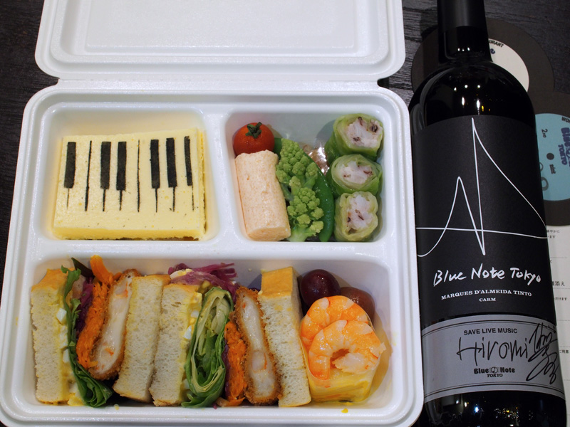 これが4つめのテイクアウト用ディナーボックスは、ひろみ嬢のリクエストにたっぷり応えた「HIROMI'S FAVORITE BOX」。海老カツサンド、タコのガリシア風魚介のロールキャベツ、ピアノ仕立てのチーズケーキ等々。ロールキャベツの下に中華麺が潜んでいるのが、まさにHIROMI’S FAVORITE。直筆サインの入ったハウスワインのボトルと共に。こちらも大満足だ。