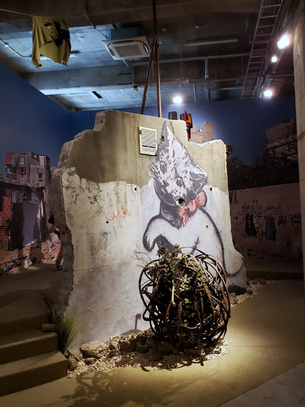 また、彼が強い関心を寄せているパレスチナ問題に関わる作品、ベツレヘムの町工場の壁に描かれた「Flower Thrower」や、イスラエル軍の攻撃を受けたガザ地区の家の壁に描かれた「Kitten」などは、その大きさや質感自体に強いメッセージが感じられる。素晴らしい展示方法だと思う。