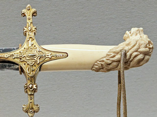 サーベルの柄(つか)は象牙製でライオンの頭の彫刻が施され、