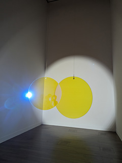 天井から2枚の円盤が吊され、回転し、横から光が投射されている。