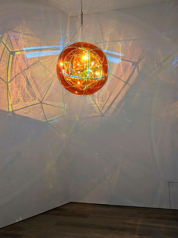 会場に入ると、まずは「蛍の生物圏(マグマの流星)」。ガラスの多面体を収めた球体が回転し、内部でLEDライトが複雑に反射している、いかにもOlafur Eliassonらしい作品だ。