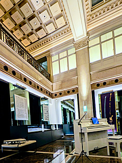 二階まで吹き抜けのホワイエは、響きすぎるのではないかと思っていたのだが、杞憂だった。小編成のアコースティック楽器を鳴らすには、程良い空間で、特にヴァイオリンは綺麗に響いていた印象だ。