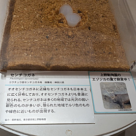 センチコガネの生態展示に添えられた「上野動物園のエゾシカの糞で飼育中!」のプレートにホッコリする。