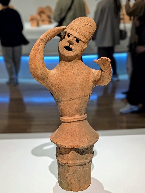 気持ち良く晴れた土曜日。入場まで10分ほど行列。まずは、「埴輪 踊る人々」が出迎えてくれる。最近の研究では、踊っているのでは無く、ウマの手綱を曳いているという説も有力らしいが、この緊張感の無い表情は、踊っていると解釈した方が似合う気がする。