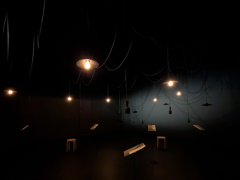 また、やはりインドのアーティスト Shilpa Guptaのインスタレーション「Listening Air」も、印象深い。暗い室内の天井から、電灯とスピーカー(マイクを転用している)が吊され、ゆっくりと動いている。スピーカーからは様々な言語の音楽が流れ、床に立てられたスタンドには歌詞が印刷された紙。不思議に居心地の良い空間だ。