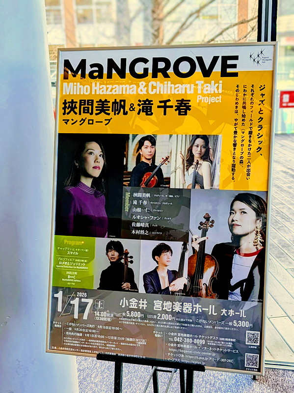 ジャズの作・編曲家 挾間美帆と、クラシックのヴァイオリニスト滝 千春が組んだプロジェクト「MaNGROVE」の公演を観に、武蔵小金井駅前にある小金井 宮地楽器ホールに行ってきた。初めて訪れるホールだが、569席の小綺麗なホールだ。