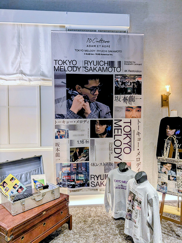 訪れた映画館は、坂本龍一が音響監修した109シネマズプレミアム新宿。ラウンジには、ポスターやTシャツ、彼が使っていたフロッピーディスクなどが展示されている。