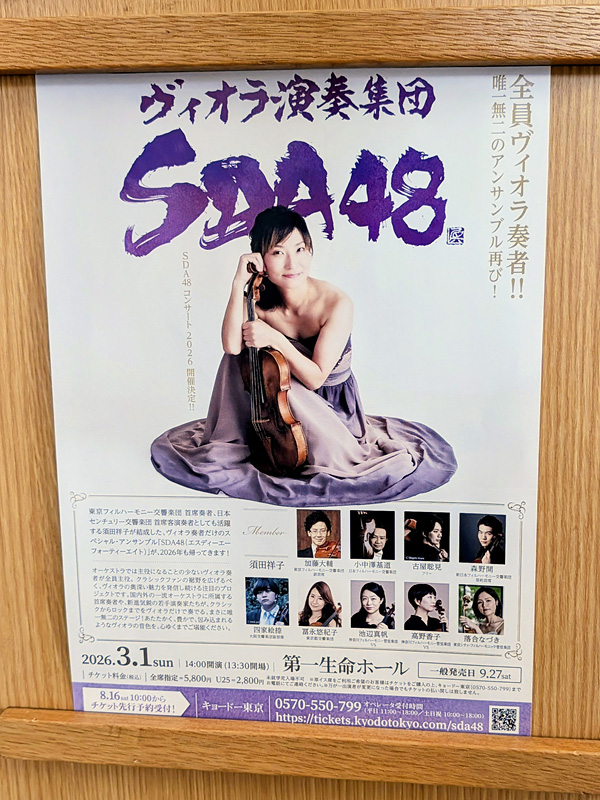 上原ひろみのプロジェクトや、挾間美帆のプロジェクトなどで、弦楽四重奏や五重奏に触れる機会があり、中でも、オーケストラの中では目立つことが少ないヴィオラに興味が増したところで、このアンサンブルのことを知ったのだ。なお、所属オーケストラの枠を超えた弦楽集団としては、石田組が有名だが(須田祥子は、その組員でもある)、SDA48が地下活動を開始したのは、石田組よりも1年早かったとのこと。