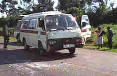 私が利用したのは、主に「ニッサン」と「プジョー」ですが、どちらも、そのメーカーの車が多いということでそのように呼ばれているようで、別に「ニッサン」が全て日産のコーチというわけじゃありません。これらは、バスターミナルのようなところにたむろしていて、お客さんがいっぱいになると発車します。ですから、目的地へ向かう車の中で、すでにお客さんが集まっているのを探すわけです。しかし、向こうもさるもので、さくらの客を集めておいて、さも、今すぐ発車しそうに見せかける輩も多いので、一筋縄ではいきません。料金はやはり交渉です。「ニッサン」は大体15〜20人近く、「プジョー」でも12人ぐらいは乗せるので、その窮屈さたるや、日本の通勤ラッシュ並み。さらに、地方へいくと舗装の悪いところもあるし、なにより、車自体が、超おんぼろなので、乗り心地はけっして良くはありません。値段は「プジョー」の方が高く、スピードも速いのですが、事故をおこす確率も「プジョー」の方が高いようです。と言う訳で、右は事故を起こした車の写真。形はニッサンだけど、これはホテルの送迎車。乗ってた客は私一人で、ドライバーが電話を探しに行った往復一時間、道端に取り残された私はポレポレ状態でした。